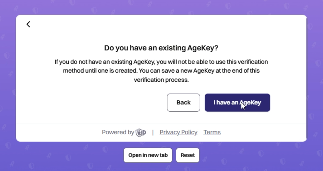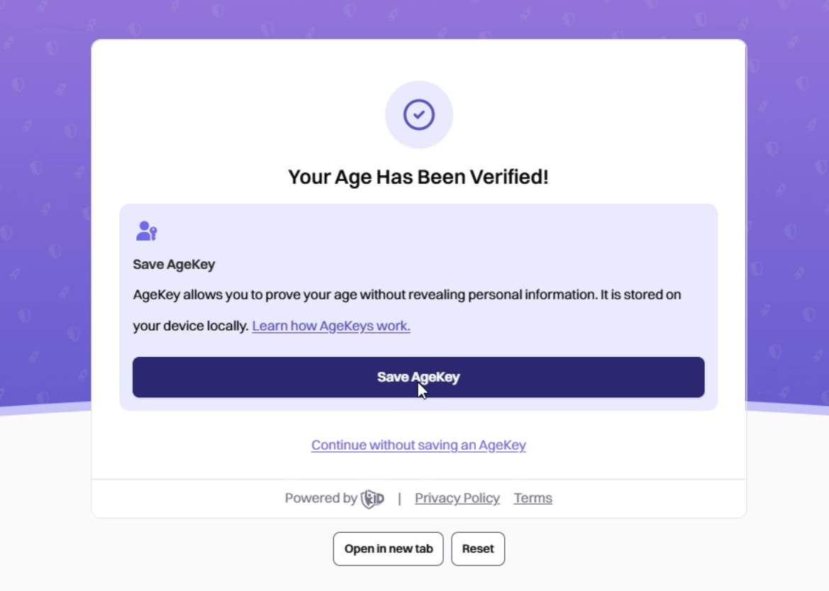 An AgeKey is a reusable age-verified token stored on the devices you own. It is created once and stored locally on your device. This allows you to provide proof of your age online without having to provide your ID or face scan again.