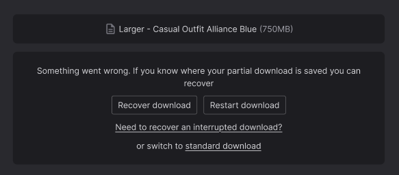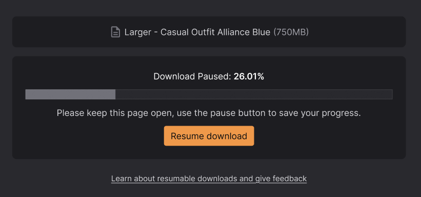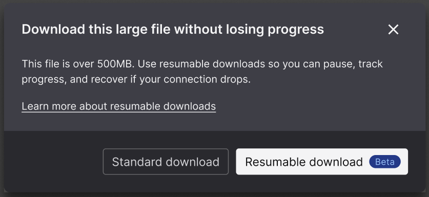 When you start downloading a file over 500MB, you will be offered a choice between "Standard download" or "Resumable download". The resumable option will then ask you to pick a destination for the file (we recommend avoiding protected folders such as C:\Program Files). The file will then be streamed directly to the selected location, and you'll see a progress bar to keep track of how much is left to download.